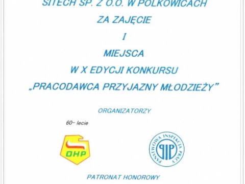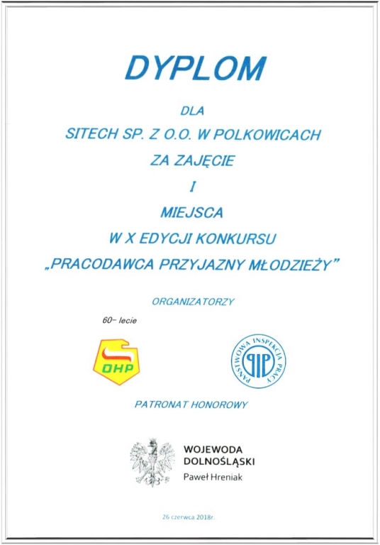 This award is for SITECH a confirmation that the company's operating principles are not only at a very high level but also worth following. Constantly developed and introduced changes within the organization of work, ensure the best possible working conditions for employees from various areas of the company, including in particular young workers. The competition jury emphasized that our direction is significantly adapted to the needs of the labor market and the expectations of the socio-economic environment.