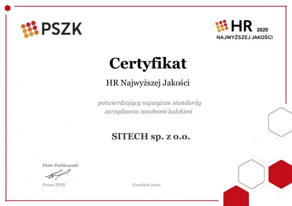 We are proud that SITECH Sp. z o.o. has obtained the HR certificate of the Highest Quality 2020 awarded by the Polish Association for Human Resources Management (PSZK).