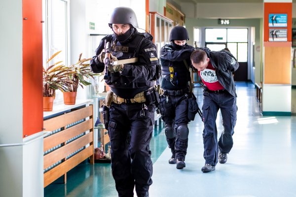 Today, a terrorist attack drill and evacuation of the school were carried out at Primary School No. 3 in Polkowice. It was a spectacular part of the project of students of the United Nations of Europe School Complex (Zespół Szkół im. Narodów Zjednoczej Europy) in Polkowice, which was helped by the District Police Headquarters in Polkowice. The students take part in the nationwide contest "Exempted from theory". The behavior of students during terrorist attacks or planting a bomb has become the subject of a social project.